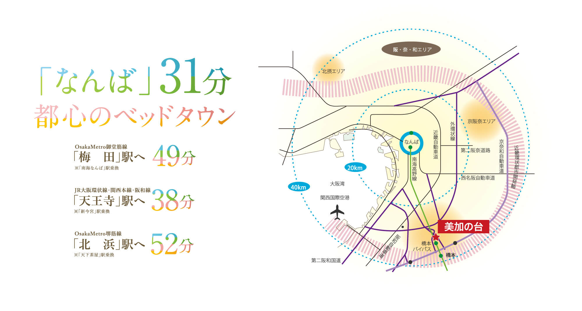 急行停車駅でもある最寄りの「美加の台」駅から南海なんば駅までは直通31分でアクセスでき、大阪市内への通勤も快適です。また、中百舌鳥からは大阪メトロ御堂筋線、天下茶屋からは大阪メトロ堺筋線へもアクセス可能で様々な大阪の主要拠点へもスムーズに行くことができます。